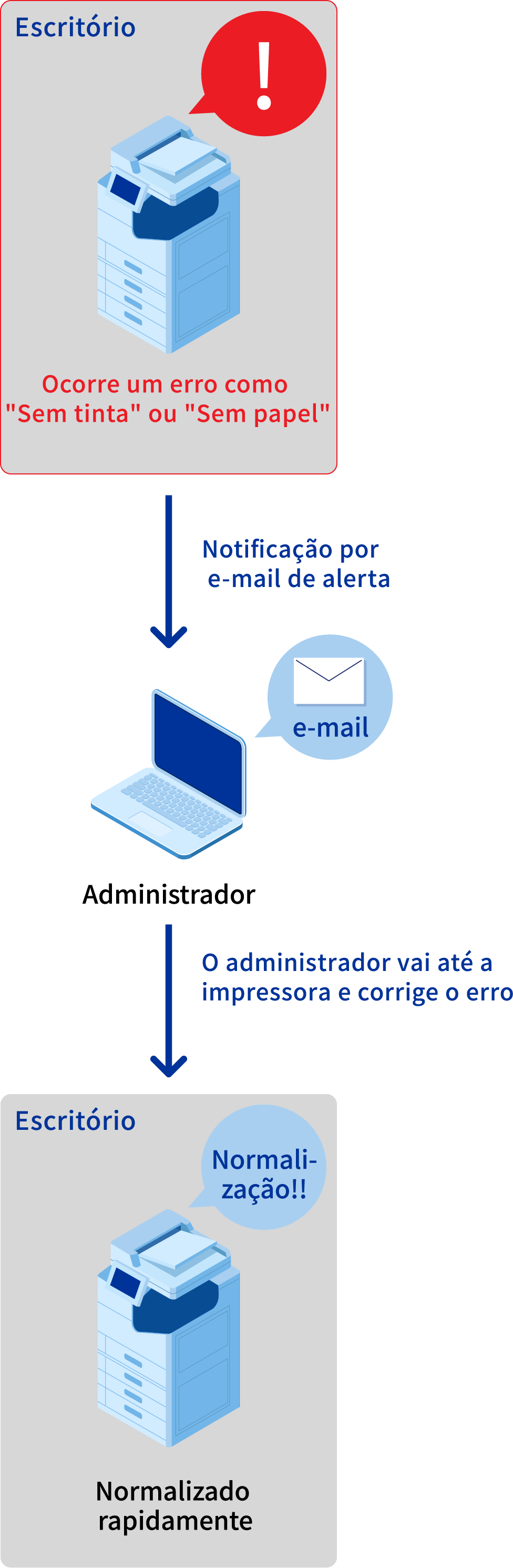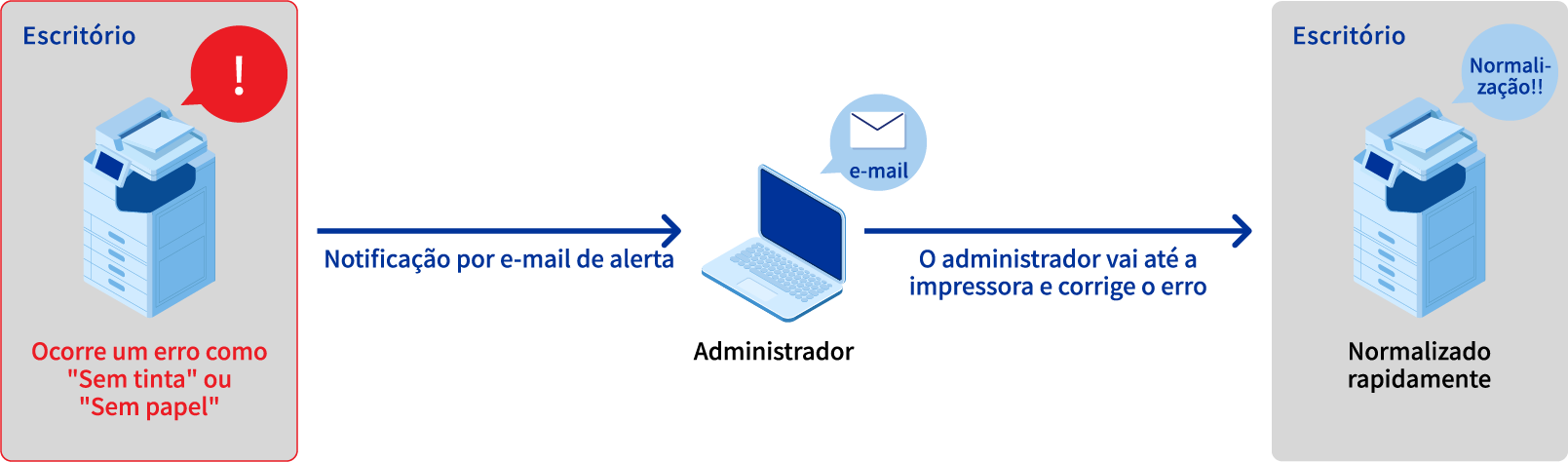As impressoras multifuncionais a jato de tinta da Epson enviam um e-mail ao administrador quando ficam sem papel ou tinta. Assim, o administrador pode ir até a impressora e solucionar o problema. Mesmo gerenciando várias impressoras, não é preciso que o administrador vá até cada uma delas para verificar seu status. Isso evita que as impressoras fiquem inutilizáveis e minimiza o tempo de inatividade.