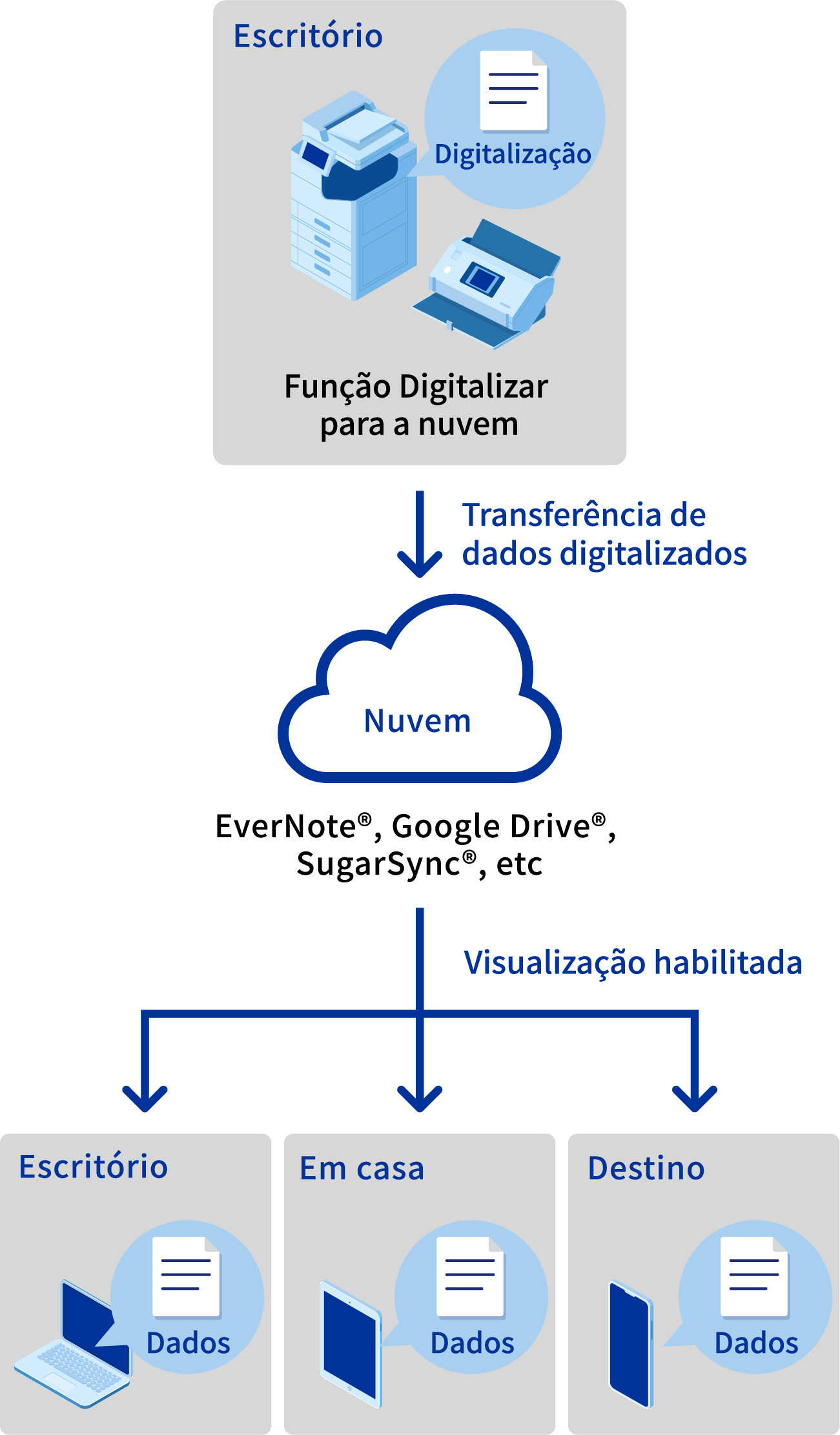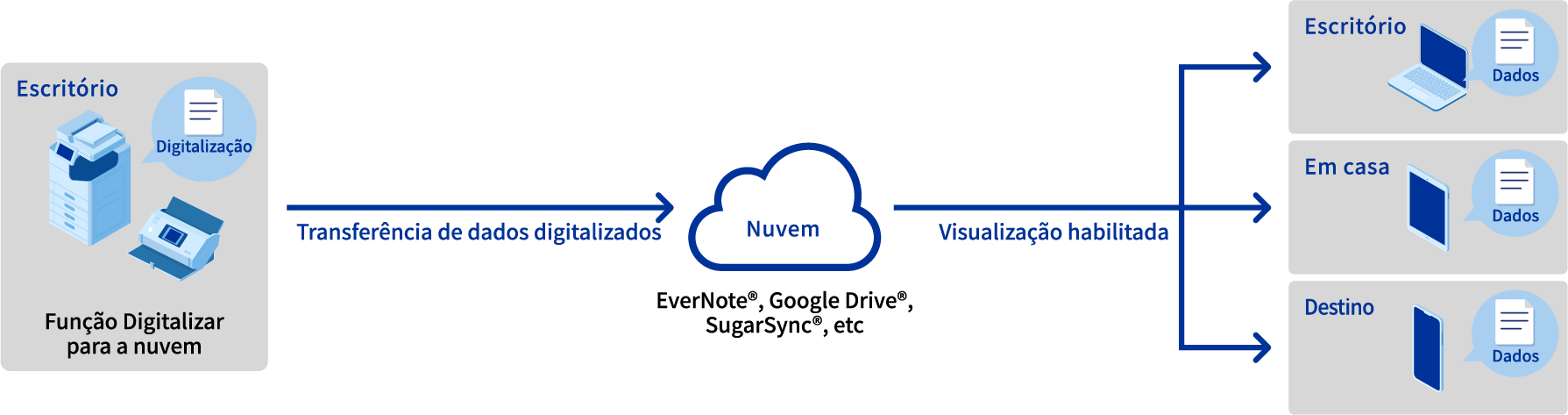 A função "Digitalizar para a nuvem" permite que você transfira dados digitalizados para um serviço de nuvem. Após a digitalização, é possível visualizar os dados de qualquer lugar pela Internet.