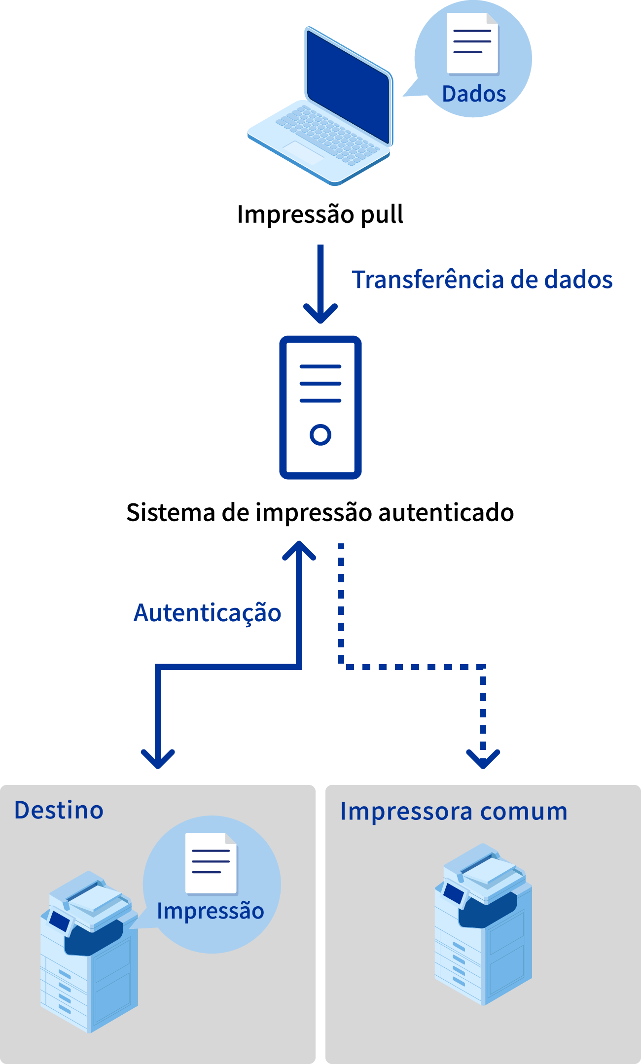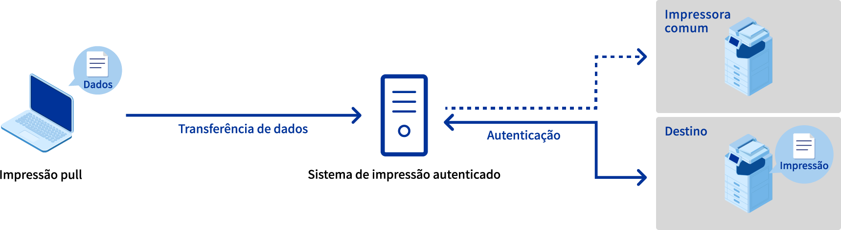 A função "Impressão pull" na opção de impressão autenticada do "Epson Print Admin" permite que você imprima usando seu procedimento de impressão usual, desde que esteja trabalhando na mesma intranet. Poder imprimir materiais em qualquer lugar também ajuda a reduzir o risco de vazamento de informações causado pela perda de documentos enquanto você estiver em trânsito.