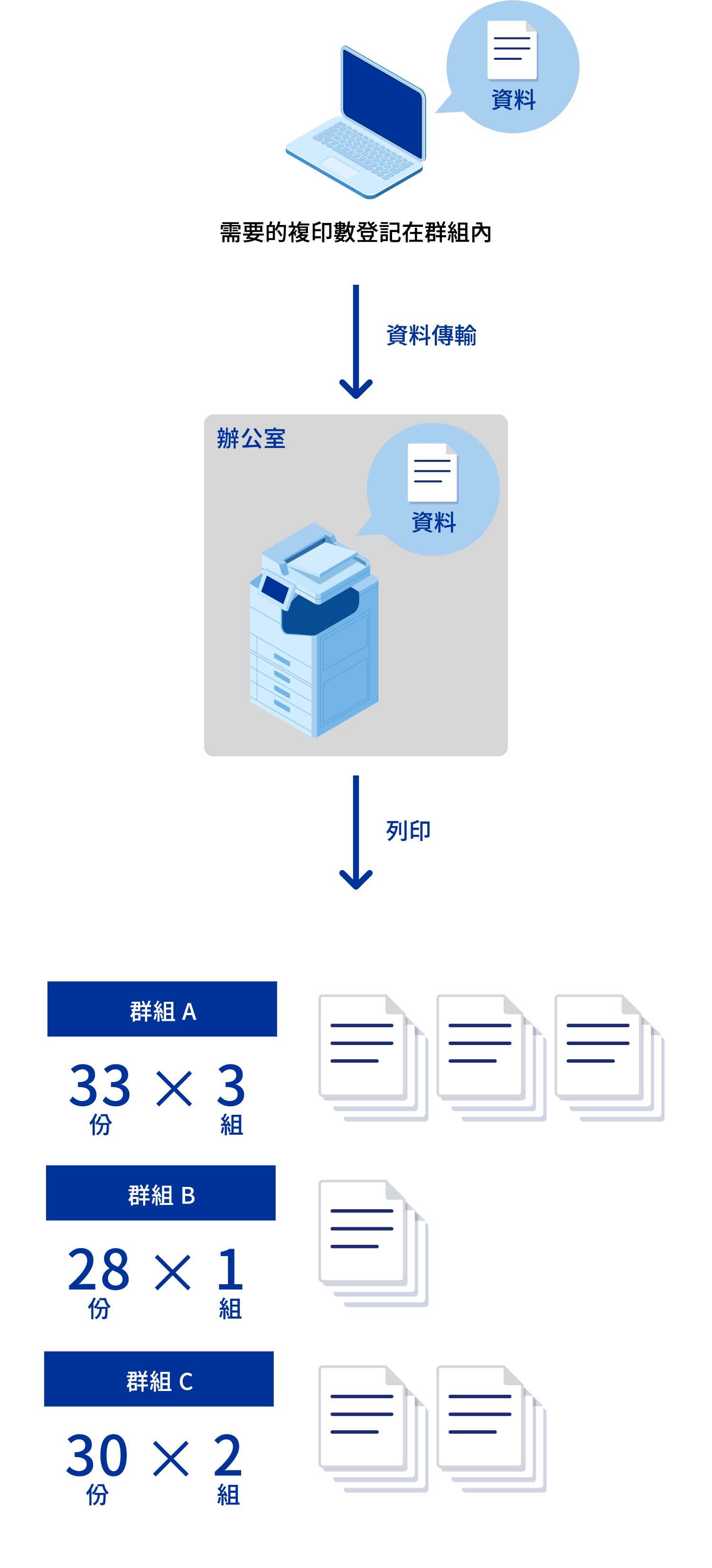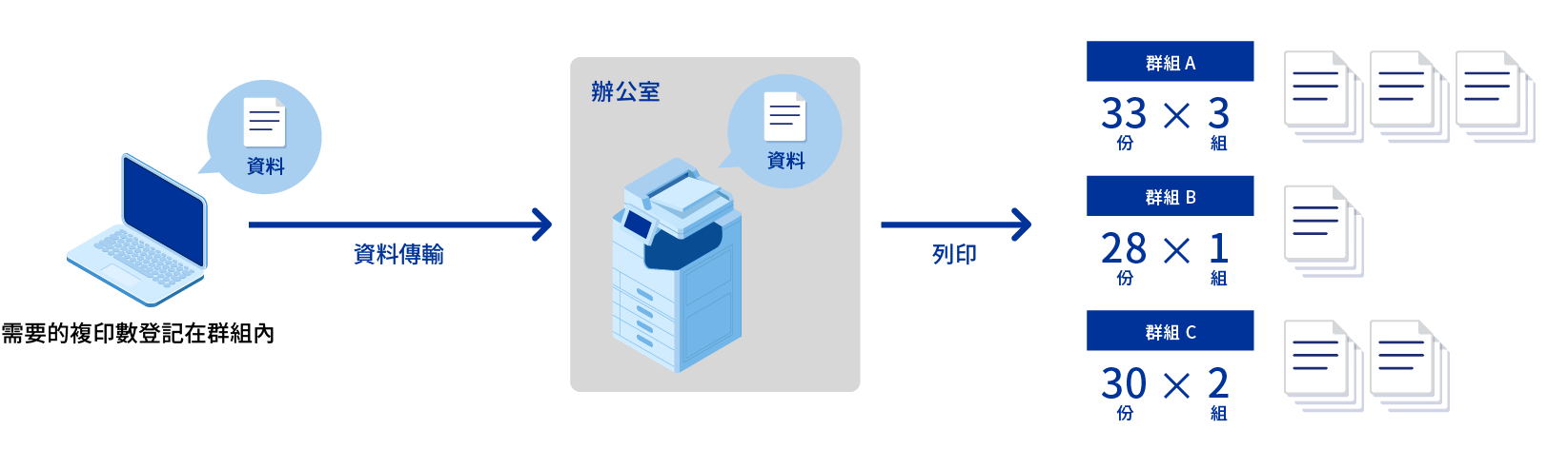 「群組列印」功能可以預先登錄列印數量和分類方法。