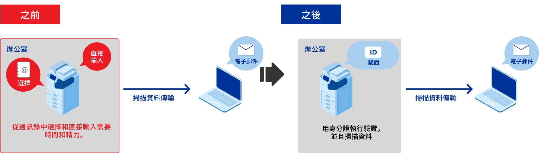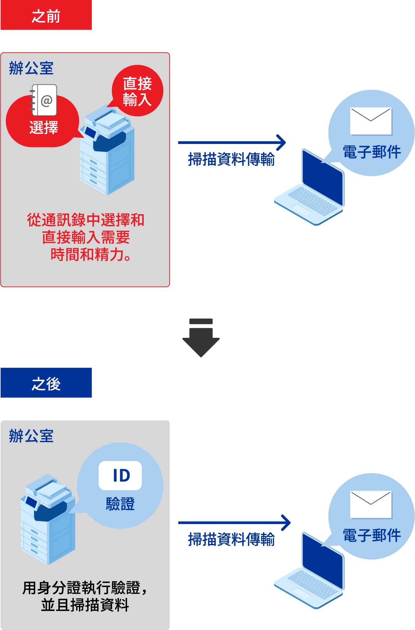 您可以使用「Epson Print Admin」驗證列印選項中的「掃描到我的電子郵件功能」,將掃描資料發送到您的電子郵件地址而無需輸入。