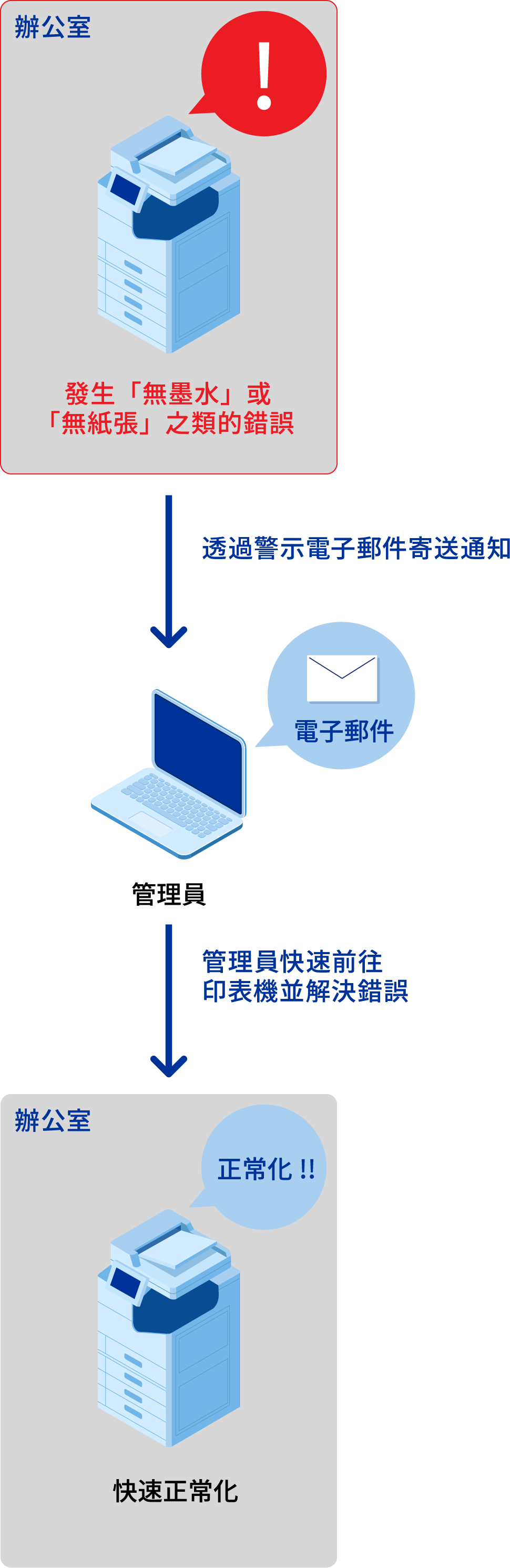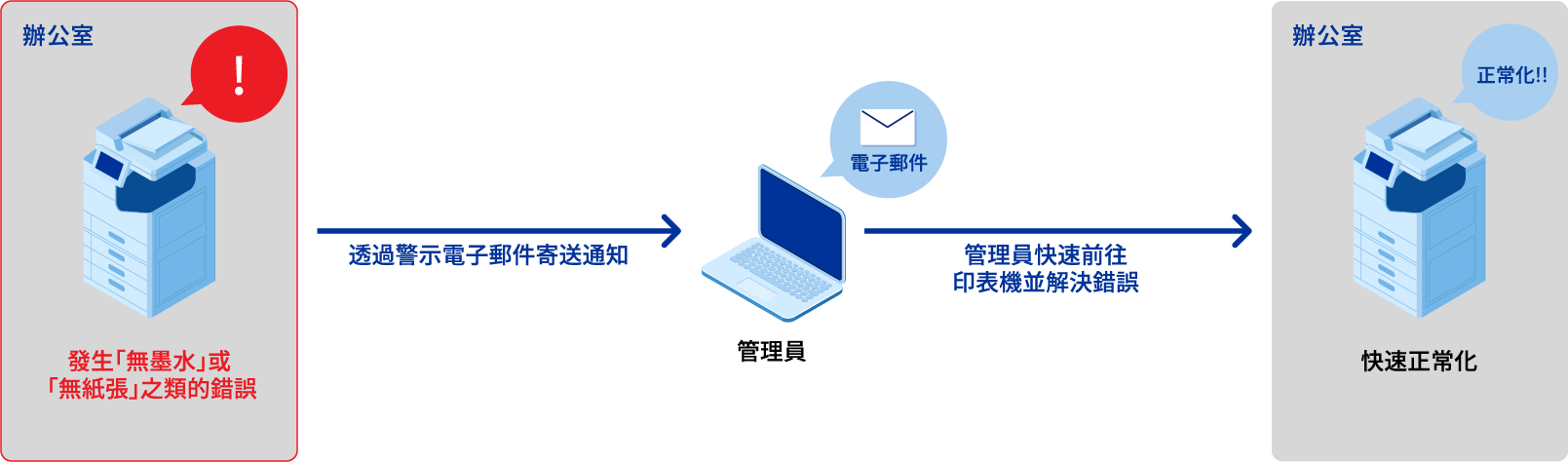 管理員也無需實際前往每台印表機檢查其狀態。