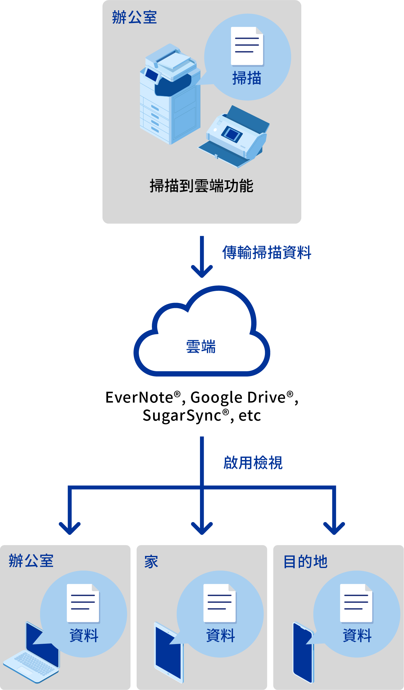 「掃描到雲端」功能可讓您將掃描的資料傳輸到雲端服務。