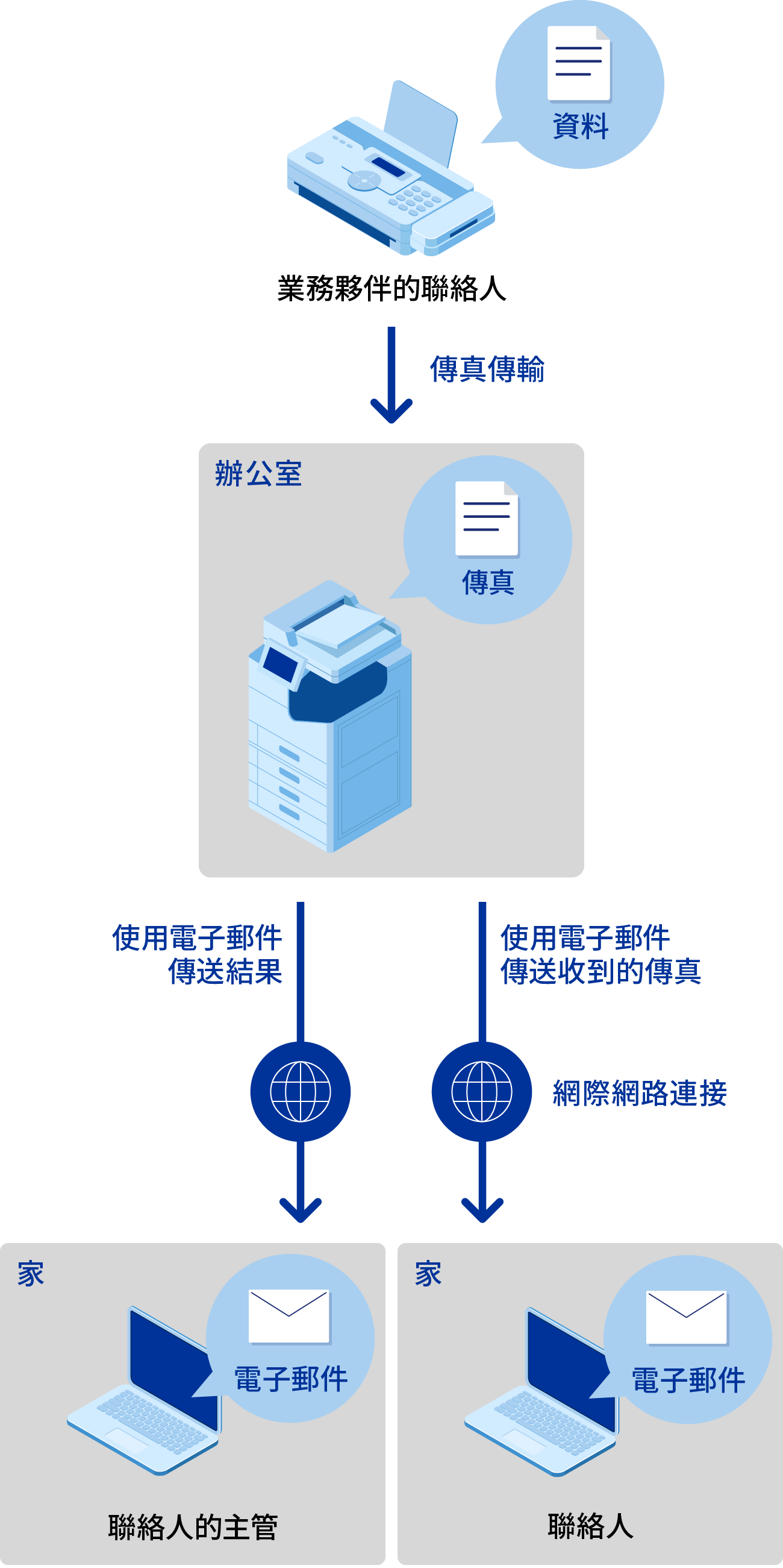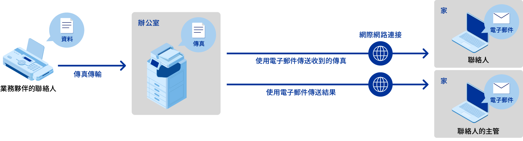 「傳真到電子郵件」功能將收到的傳真透過電子郵件傳送給聯絡人。這使您可以在家中工作時查看在辦公室收到的傳真,提高工作效率。還提供透過電子郵件